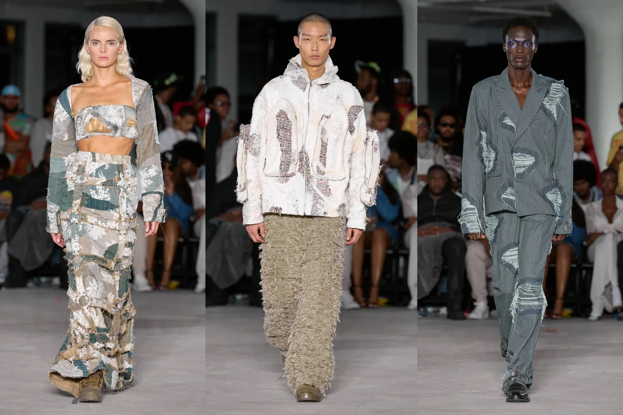 Who Decides War, a streetwear brand, mixes black aesthetic with church imagery and distressed denim. It's backed by late mentor Virgil Abloh and collaborates with notable celebrities. The brand creates an inclusive space for black creatives and has been referred to as a hip-hop festival or the new Rolling Loud.For a little more background, Bravado's father ran a tailor shop named "Alterations Consultants," paying homage to his father; this is the collection's name inspired by tailoring notes he saw growing up. The brand still has its signature arches, use of pockets, and, of course, denim sprinkled throughout the 39 looks. However, compared to their past body of work, it's clear that they are pushing the envelope with the designs. The arches go from just artwork to being used as pockets in many garments. The collection also graduates into more than just a streetwear brand. Featuring mixed distressed fabrics and deconstructed suits and skirts, Bravado also plays with that Victorian style mentioned earlier, debuting their take on corsets next to tactical-looking hoodies, overcoats, and reworked button-ups. Everyone can participate in this luxury brand, and its authenticity has gotten it this far.