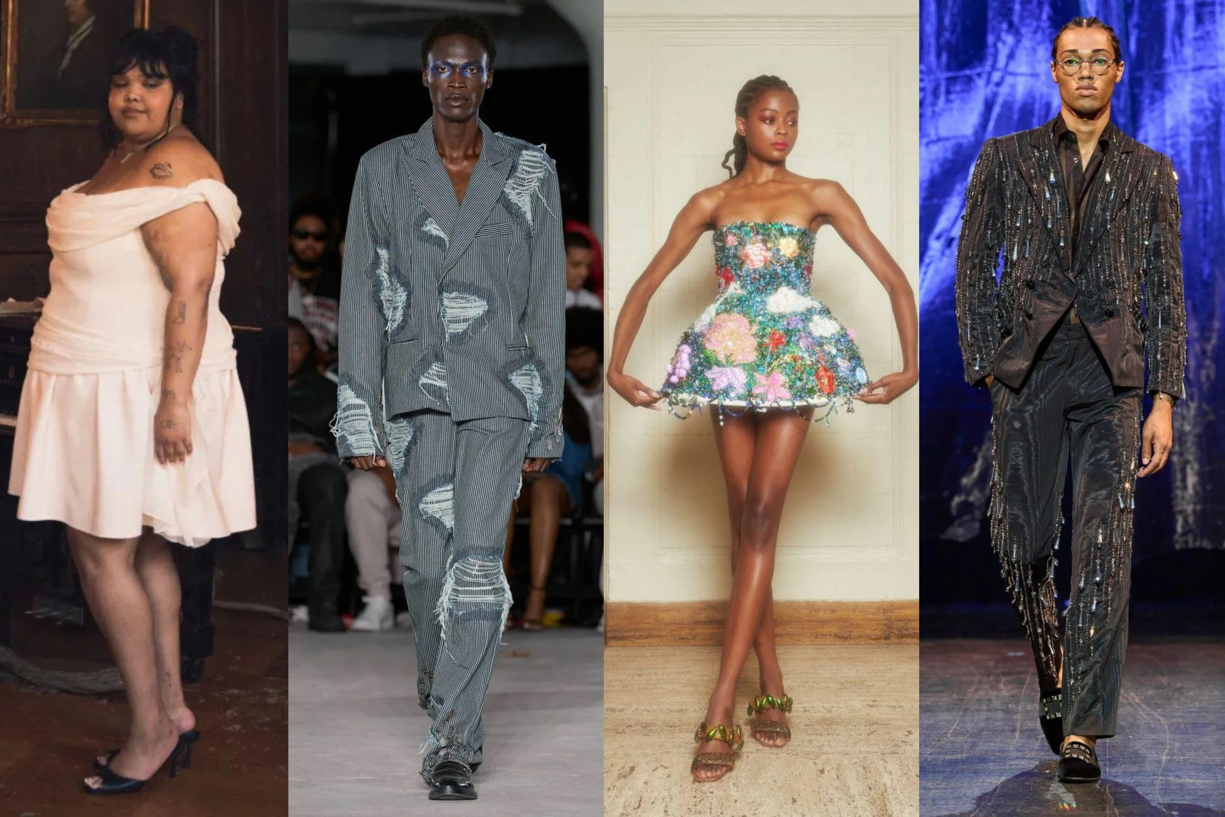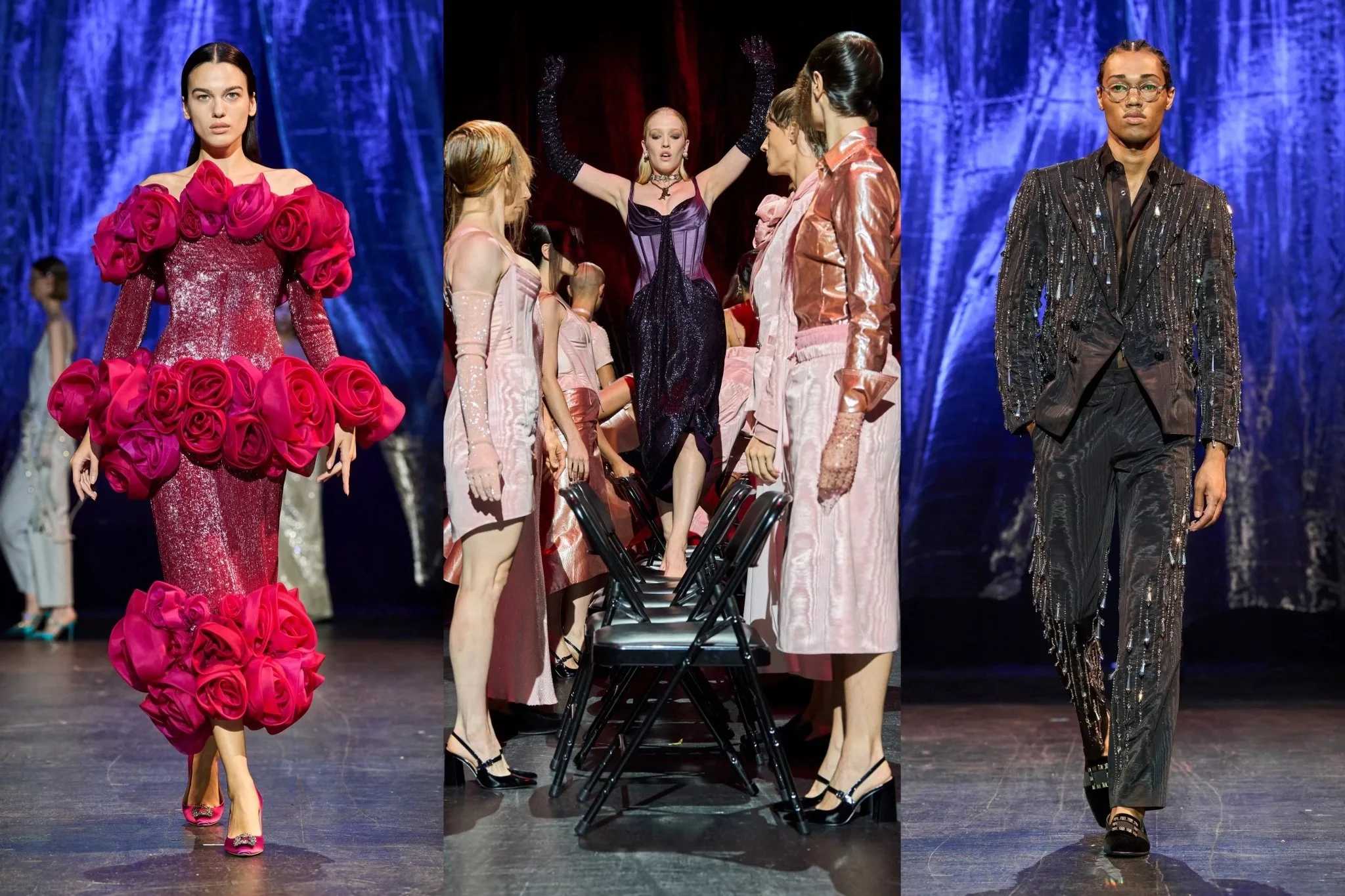 Opulence, theatrics, and star quality are the first things to come to mind when looking at the presentation from Wiederhoeft's SS24 collection named "Night Terror at the Opera." The show starts with a handful of models sitting in the middle of the runway on folding chairs, dressed in peach and pink outfits, while one model labeled the "starlet" is led to an empty seat in the middle of the ensemble.Wearing a black sequin gown, this starlet begins to lead the pack in choreographed sequences, evolving into a game of duck, duck, goose, acting as a courtroom, a class of students, etc all this leads to the ensemble walking out through the crowd and the starlet walking behind the curtain as the real show begins. Being mentored by Thom Browne and having a background in making bridal wear, Jackson Wiederhoeft is no stranger to making quality clothing. The runway had a mix of over-the-top couture garments like suits and corsets with massive proportions while showing more wearable pieces like tank tops, gowns, and suits with… normal proportions. While the looks were the most important part of the show, how the models performed during the showcase makes this unique. Organized chaos. Models Ballroom dancing, waving to the audience, emoting, just putting on the show of their lives. This has made Wiederhoeft one of the best shows from this past NYFW.